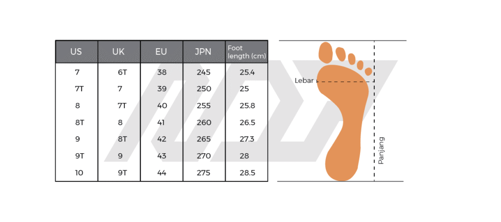 - Gunakan ukuran kaki yang lebih panjang dari kedua pengukuran tersebut pada tabel ukuran untuk menemukan ukuran yang tepat sesuai dengan panjang kaki yang tercatat. Jika hasil pengukuran berada di antara dua ukuran, disarankan untuk memilih ukuran yang lebih besar.